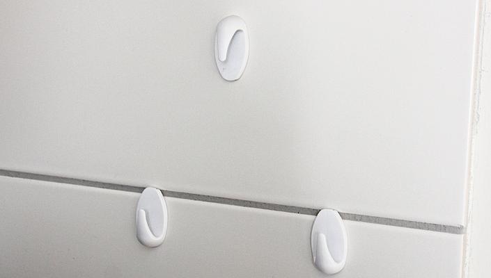 Überprüfe, ob die Klebehaken gut kleben, sonst fällt dir dein Gerät herunter. Der obere Haken sollte außerdem nicht zu eng gesetzt sein, damit man das Tablet bequem raus- und wieder reinschieben kann.