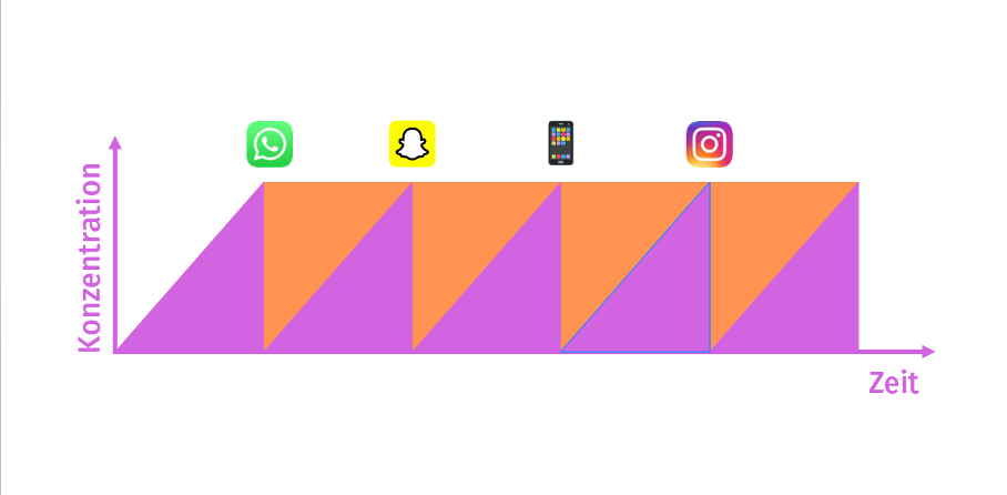 Kommt dir diese Situation bekannt vor? Das Handy kann ganz schön ablenken! Dabei geht es unserer Konzentration wie es in dem Bild unten zu sehen ist. Sie steigt und steigt und steigt … und sobald man abgelenkt wird, bricht sie schlagartig ab und muss sich erstmal wieder neu aufbauen. Das sorgt dafür, dass man viel weniger lernt, als man vielleicht denkt. Da saßt du eigentlich 2 Stunden vor deinen Matheaufgaben und fühlst dich super produktiv, aber effektiv hast du leider nur eine Stunde gearbeitet.