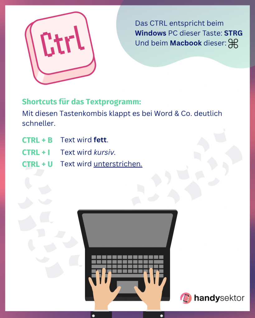 Wenn du privat oder für die Schule am PC unterwegs bist, können kleine Tastenkombination deine Arbeit erleichtern. Wir zeigen dir die gängigsten Shortcuts für Textprogramme, wie Word, aber auch für andere Programme und Browser.