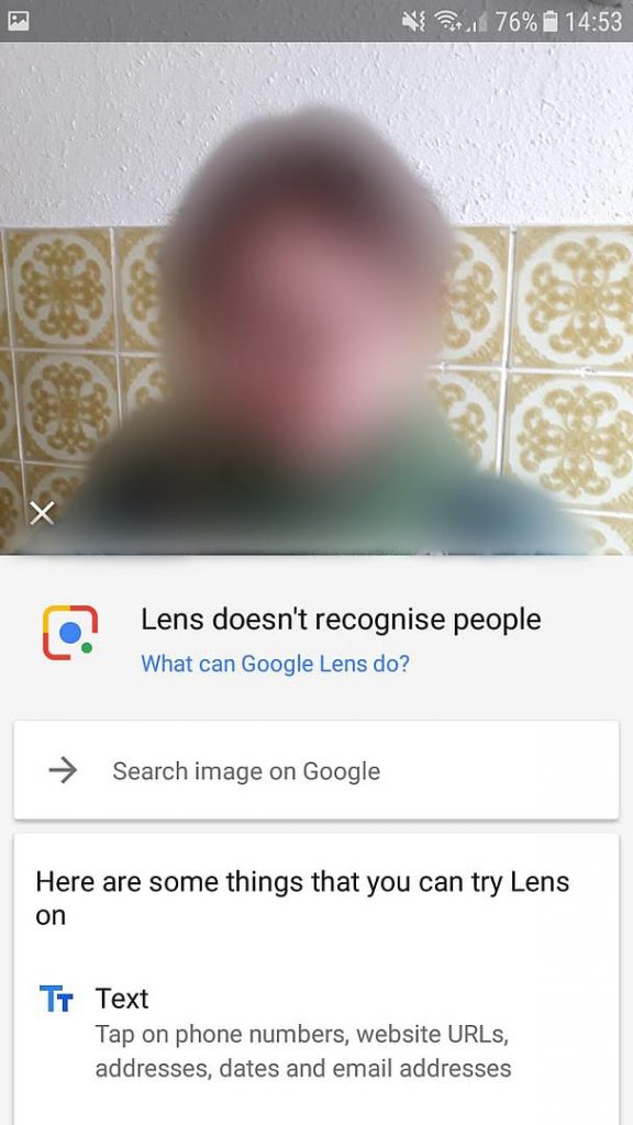 Nur Menschen erkennt Google Lens noch nicht. Das ist ja vielleicht auch ganz gut so… man möchte ja nicht immer auf jedem Foto sofort erkannt werden. Allerdings will Google Lens in zukunft noch weitere Funktionen hinzufügen. Ob irgendwann auch Menschen erkannt werden? (Bild: Screenshot Google Lens)