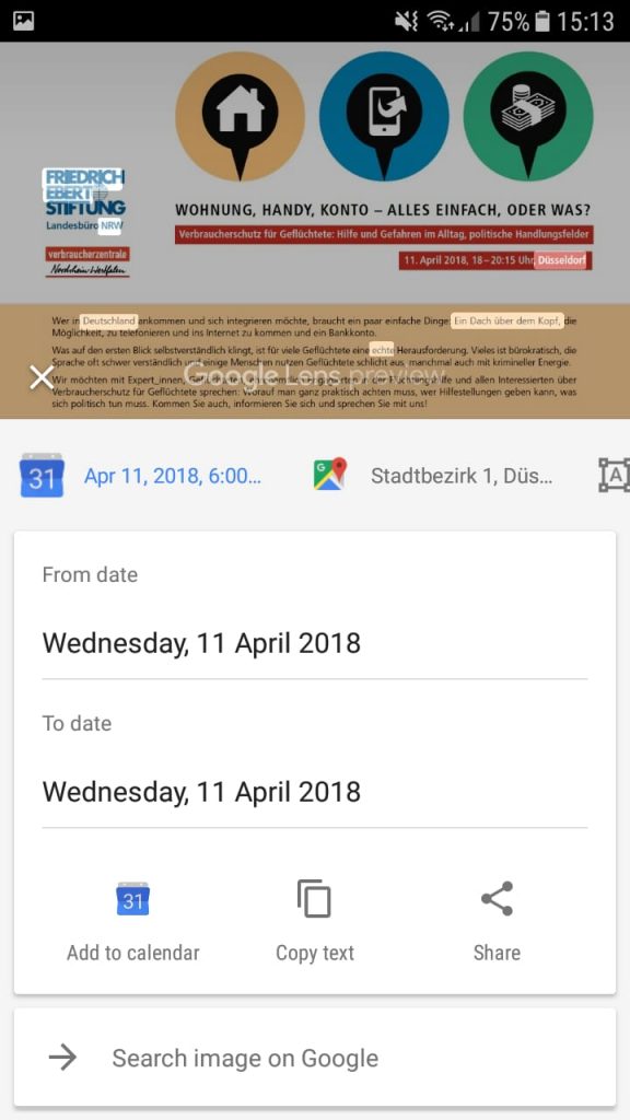 Termine von einem Flyer oder Plakat können mit Google Lens nach dem Abfotografieren direkt in den Kalender eingetragen werden. (Bild: Screenshot Google Lens)