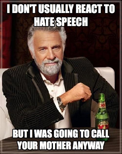 Der Herr aus einer Bierwerbung gibt Schein-Weisheiten von sich. In diesem Fall meint er zwar, dass er normalerweise nicht auf Hate Speech reagiert, aber es trotzdem tut weil er sowieso „deine“ Mutter anrufen wollte.
