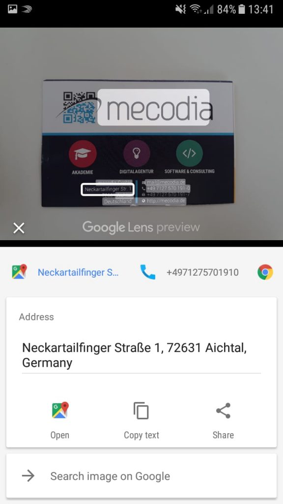 Abfotografierte Visitenkarten können im Adressbuch gespeichert, Telefonnummern direkt angerufen und Adressen mit Google Maps geöffnet werden! (Bild: Screenshot Google Lens)