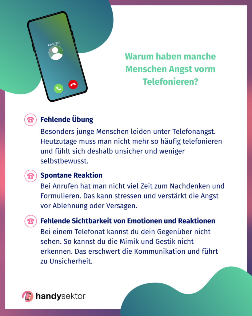 Besonders junge Menschen, die mit Smartphones aufgewachsen sind, leiden häufig unter Telefonangst. Der Grund: fehlende Übung. Wer selten zum Hörer greift, fühlt sich unsicherer und weniger selbstbewusst. Früher war das Telefonieren die einzige Möglichkeit, über Entfernungen hinweg zu kommunizieren. Demnach ist es für Ältere selbstverständlich, zu telefonieren. Heutzutage gibt es aber viele andere Kommunikationswege. Während man bei E-Mails und Chatnachrichten lange Zeit zum Überlegen und Formulieren hat, muss man bei Anrufen spontan sein. Damit steigt die Angst vor Ablehnung, Kränkung oder Versagen. Ebenso bedeutet dies einen gewissen Kontrollverlust und die Konfrontation mit einer unbekannten Situation und einer fremden Person. Auch die fehlende Sichtbarkeit von Emotionen und Reaktionen am anderen Ende erschwert die Kommunikation und führt zu Unsicherheit.