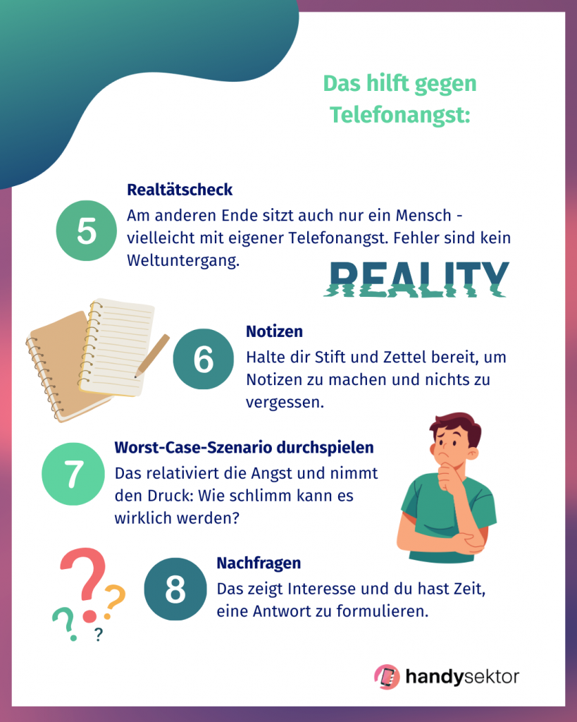 Wichtig: Die schlechteste Strategie ist, gar nicht zu telefonieren – das verstärkt die Angst nur. Am besten ist es, die Situation vorzubereiten, sie durchzuführen und hinterher festzustellen: „War ja gar nicht so schlimm“.